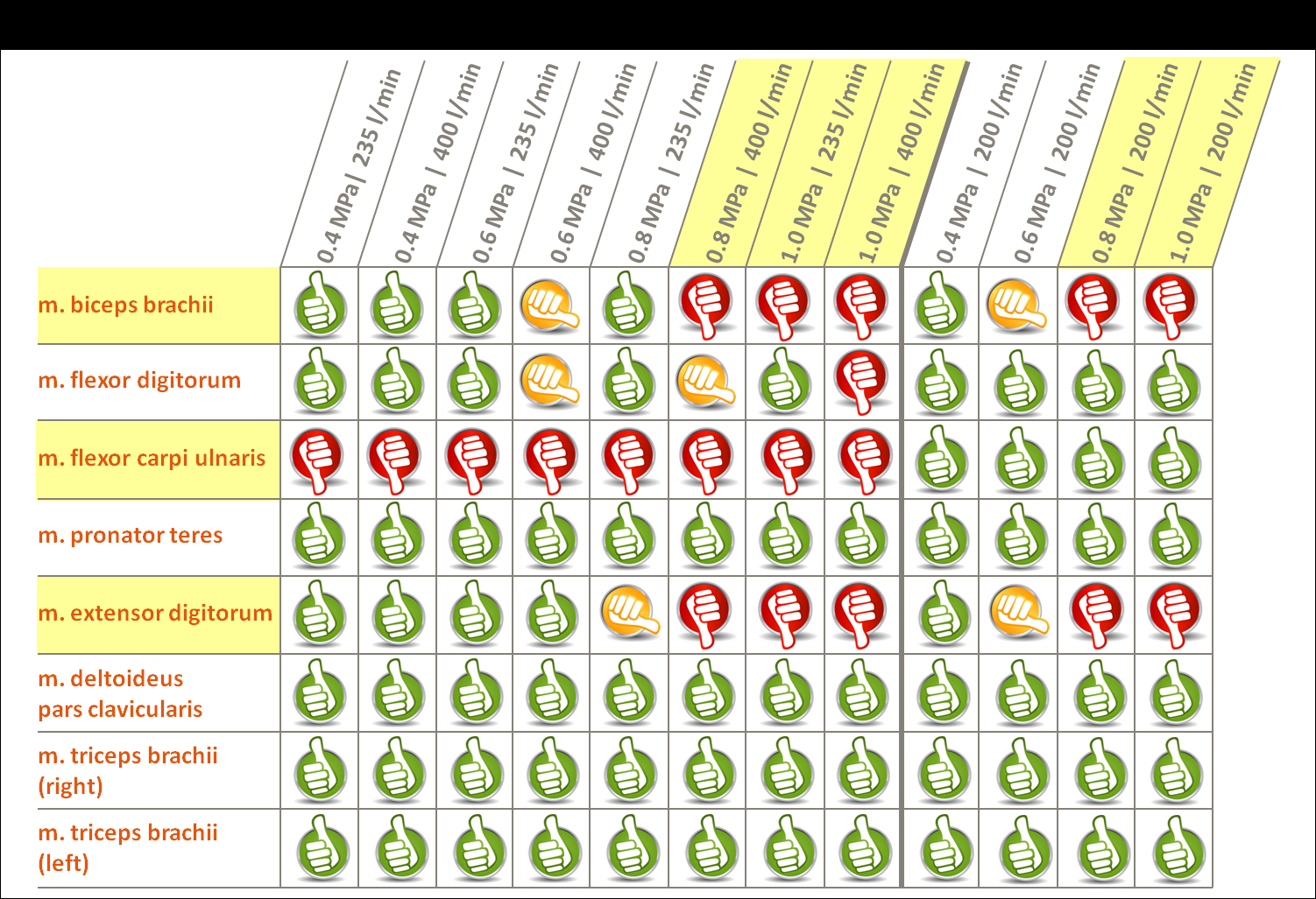 The biceps brachii, flexor carpi ulnaris and extensor digitorum of the right hand-arm-shoulder system represented the work-physiological bottleneck. For these muscles 0.8 MPa and 235 l/min were just acceptable whereas 0.8 MPa and 400 l/min as well as 1.0 MPa with both flow rates exceeded the specified limits above.