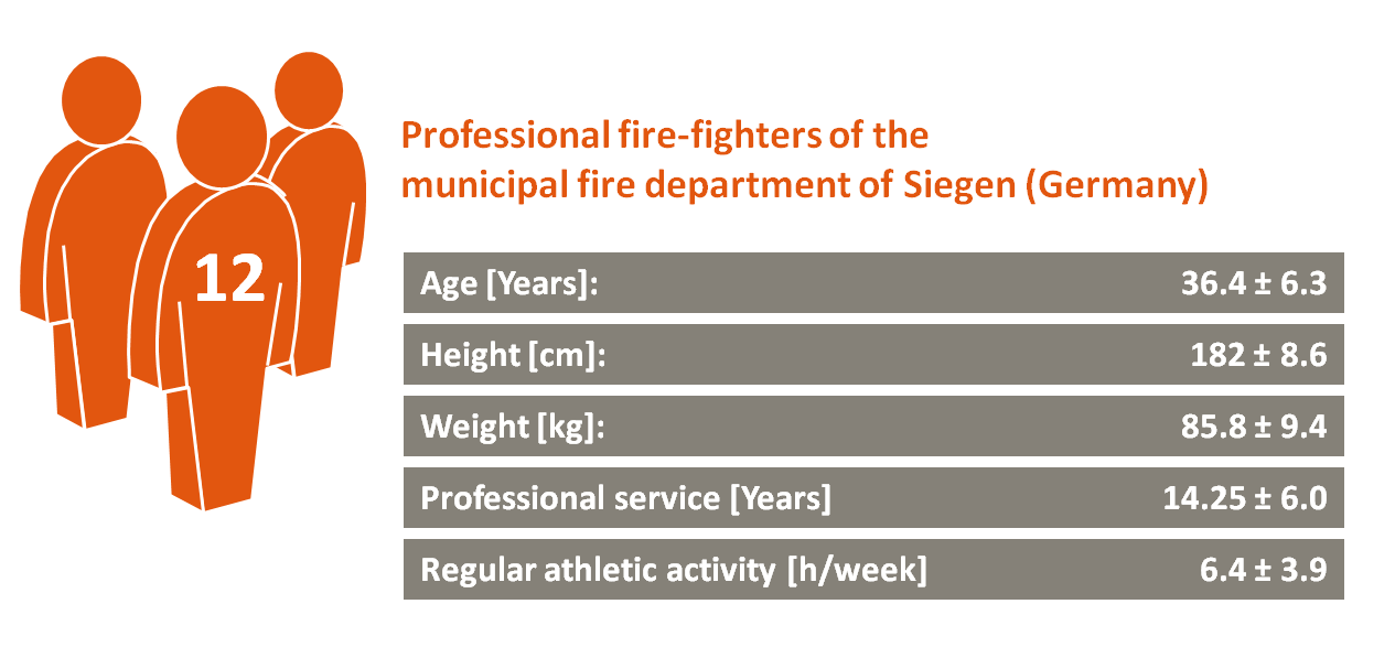 12 professional male fire-fighters carried out simulated fire-fighting procedures under realistic conditions. All participants were of normal build and right-handed.