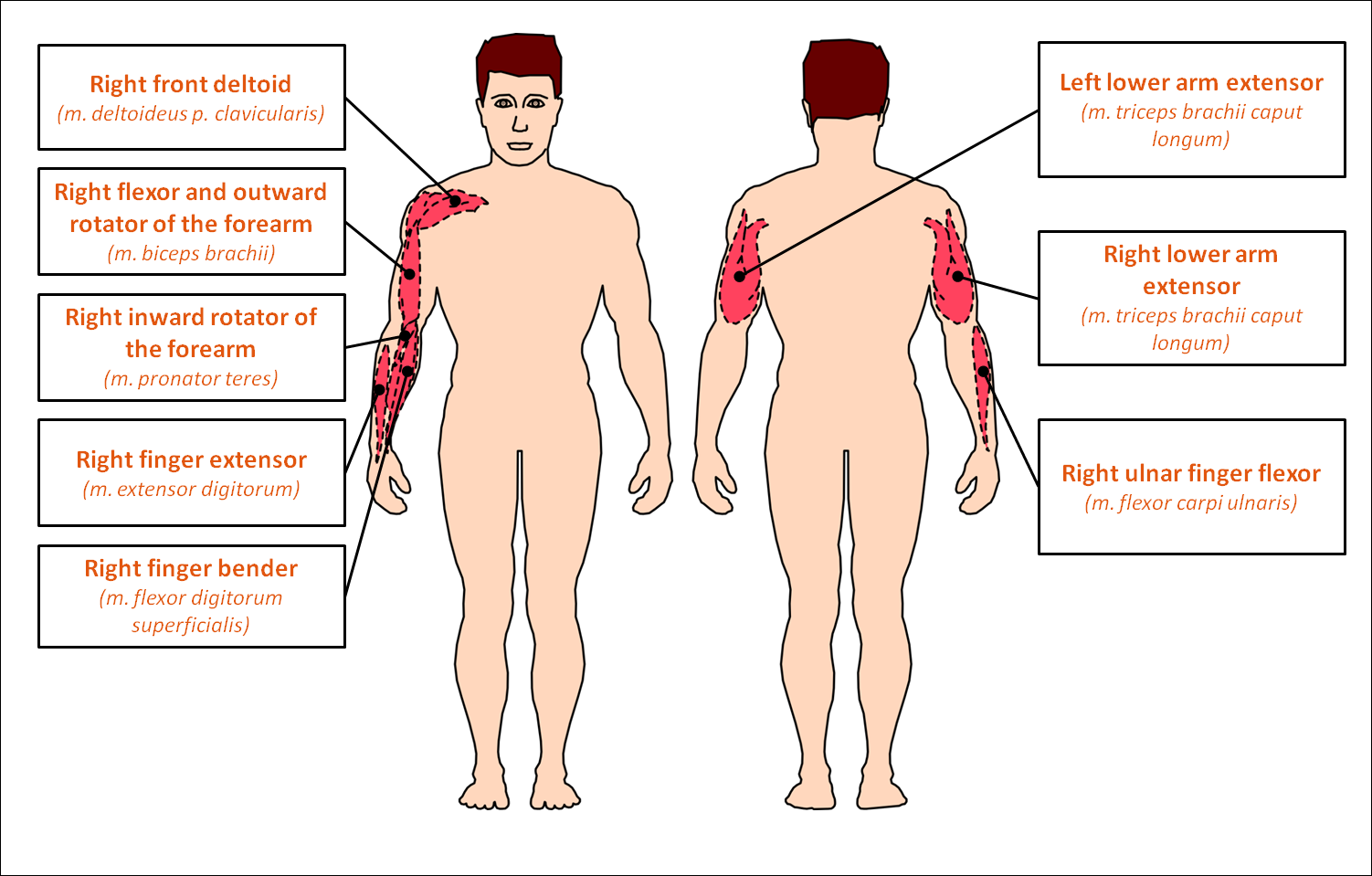 Throughout the entire test, the electromyographic activity (EA) from 7 muscles of the right hand-arm-shoulder system and one muscle of the left arm was recorded. Additionally, a special questionnaire had to be filled in to evaluate the subjective responses when handling the branchpipes with the varying pressure and flow rates. Static strain was expected for the muscles of the right side when the branchpipe was held in the right hand. The left hand carried out dynamic work as it opened, closed and operated the branchpipe.