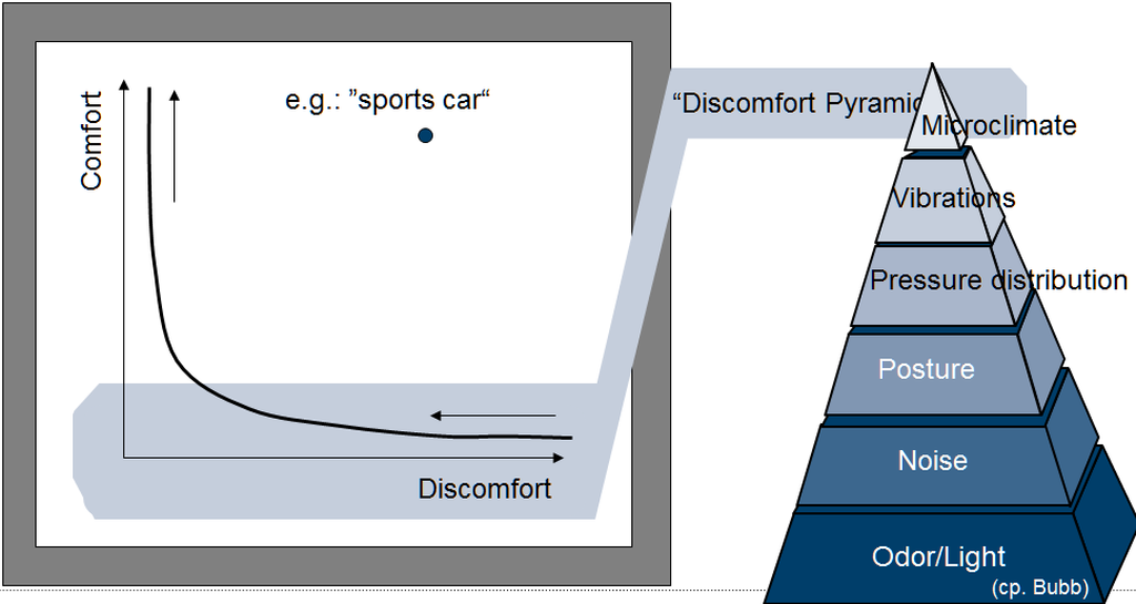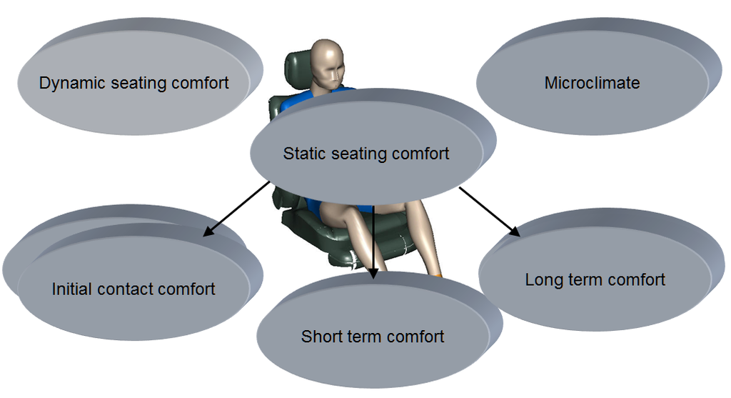 A central question in the development of new seats is the seat comfort. Developers are very concerned about ways to measure the comfort objectively. Therefore, the focus of developers are models that establish a relationship between objective measures and subjective sensation which allows a virtual prediction of seat comfort. Mergl considers the measurement variables posture, microclimate, vibration and pressure distribution for detecting the seating comfort. He comes to the conclusion that the pressure distribution is the best parameter for determining the seat (dis)comfort in seat development.