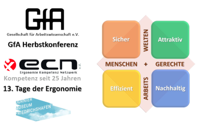 Die 13. Tage der Ergonomie „Von der Wissenschaft in die Praxis“ für die Regionen Deutschland, Österreich und die Schweiz (DACH) finden im Jahr 2026 nicht wie schon gewohnt im Monat März und im Competence Park Friedrichshafen statt. Anlässlich des 25-jährigen Bestehens des Ergonomie-Kompetenz-Netzwerkes e.V (ECN) wird die Veranstaltung am 17. + 18. September 2026 im Dornier-Museum in Friedrichshafen zusammen mit der Herbstkonferenz der Gesellschaft für Arbeitswissenschaft (GfA) durchgeführt.
