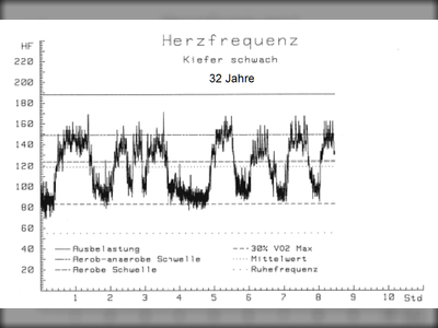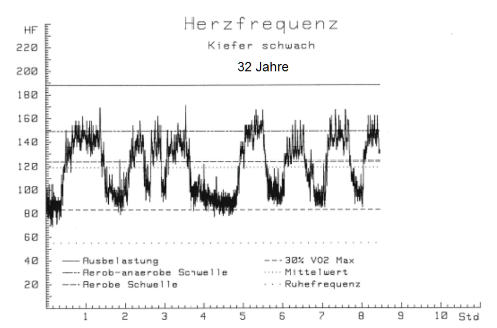 Tageshistogramme der Herzfrequenz über den Arbeitstag zeigten, dass bei professionellen Waldarbeitern durchaus zweigipfelige Verteilungen auftreten, die sonst nur im Hochleistungssport zu finden sind. Unter normalen Bedingungen ist das Herz- Kreislaufsystem gut abgesichert und der professionelle Waldarbeiter auf die Belastungen vorprogrammiert.