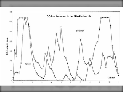 Kohlenmonoxidimissionen bei der Aufarbeitung von zwei starken Fichten. Baum A (3,46 fm), Baum B (3,6 fm)