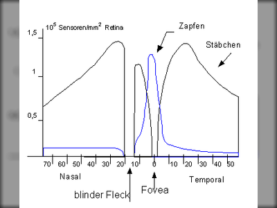 „Die menschliche Netzhaut besteht aus Zäpfchen und Stäbchen, wobei die Zäpfchen, die Fotorezeptoren für das Sehen bei Licht höherer Intensität (bei Tag) und für das Farbsehen sind. Die Stäbchen ermöglichen das Sehen bei Licht niederer Intensität (bei Nacht), wobei keine Farbinformationen wahrgenommen werden (Schwarz-Weiß-Sehen). Zusätzlich befinden sich Stäbchen eher in den Randbereichen der Retina, so dass die Bilder bei Nacht eher unscharf wahrgenommen werden. Die Zäpfchen tragen zur Farbwahrnehmung blau-, grün- und gelbsensible Fotopigmente und liegen im Zentrum der Netzhaut.