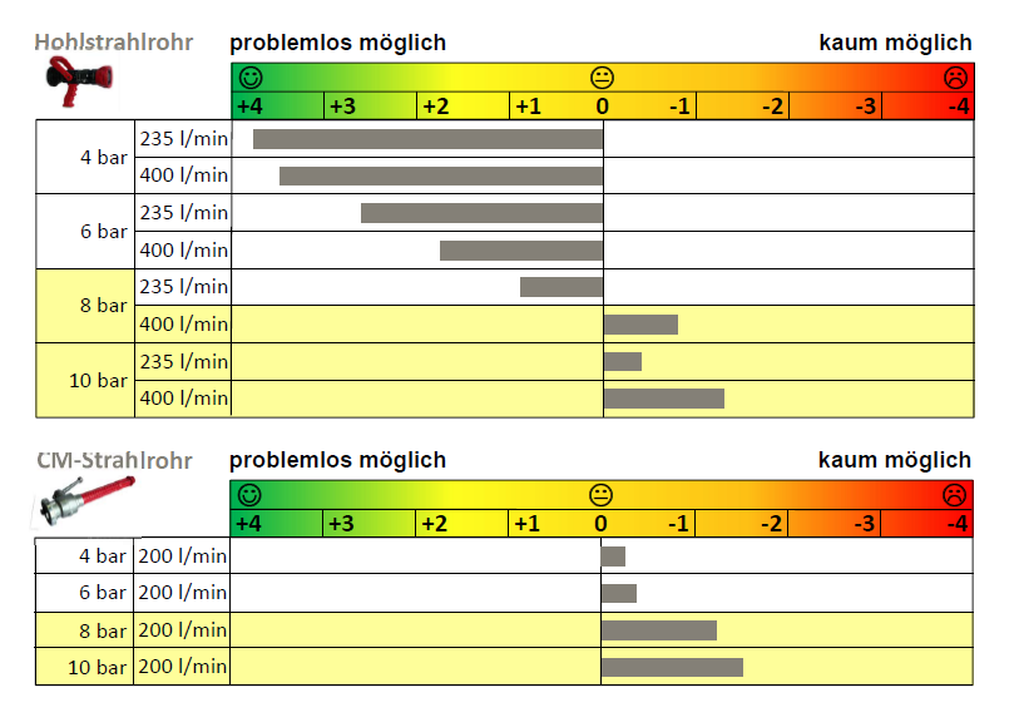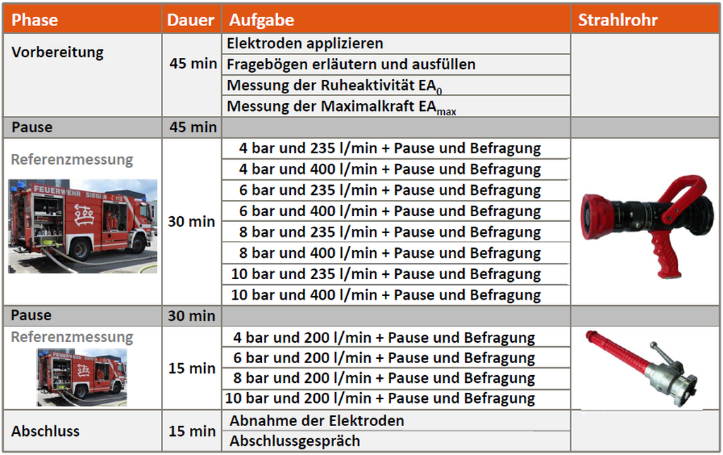 Die Testpersonen verwendeten das klassische CM-Strahlrohr (Volumenstrom 200 l/min) und ein AWG-Hohlstrahlrohr (Volumenströme 235 und 400 l/min). Es galt bei Drücken von 4-10 bar zunächst im Stehen einen Vollstrahl 30 Sekunden lang zu halten und anschließend im Knien und Stehen Sprühstöße in unterschiedliche Strahlrichtungen nach einem definierten Versuchsablauf abzugeben. Nach jedem Durchgang mit einem festgelegten Volumenstrom wurde der Druck um 2 bar erhöht.