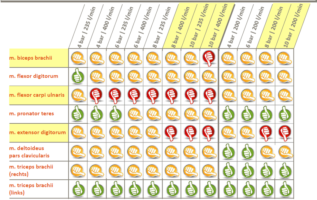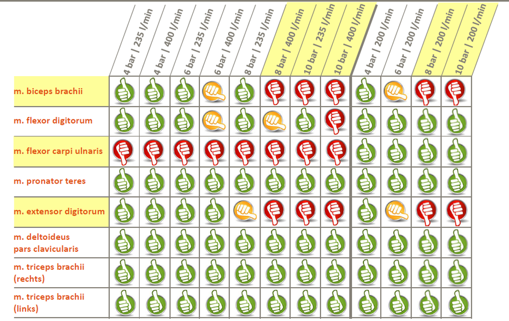 Für die höher beanspruchten Muskeln m. biceps brachii, m. flexor carpi ulnaris und m. extensor digitorum war bei Benutzung des Hohlstrahlrohres eine Einstellung von 8 bar und 235 l/min meist noch akzeptabel da unterhalb der zuvor genannten Grenzwerte, wohingegen 8 bar und 400 l/min sowie 10 bar und beide Volumenströme die Grenzwerte überschritten.