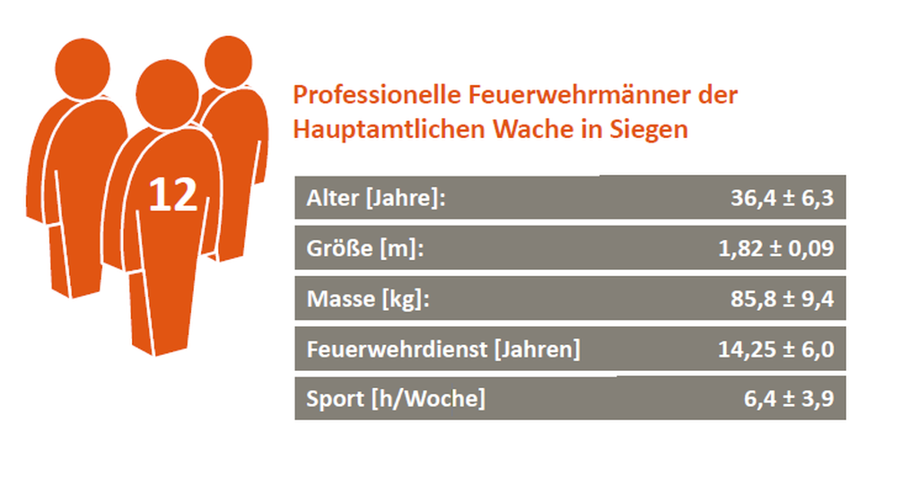 12 professionelle Brandbekämpfer führten realitätsnahe Löscheinsätze durch. Alle Probanden waren von normaler Statur und Rechtshänder.