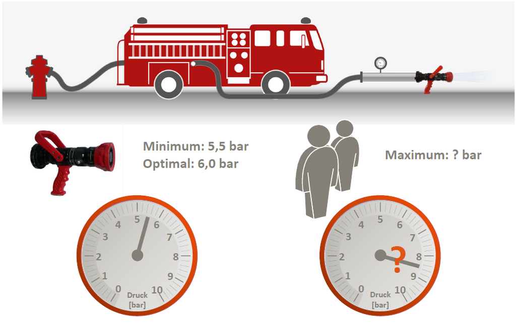 Auf Basis der vorliegenden Ergebnisse sollte der Druck bei der Löschwasserversorgung auf 6 bar eingestellt werden. Nur so kann sichergestellt werden, dass die Strahlrohre ordnungsgemäß arbeiten und der Löschvorgang sicher und zielgerichtet ausgeführt werden kann.