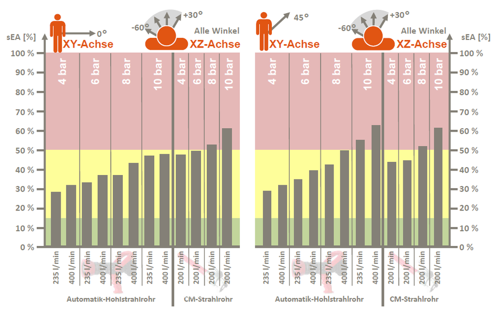 Erwartungsgemäß nahm die mittels isometrischer MVC (Maximum Voluntary Contraction) standardisierte EA mit steigendem Druck und Volumenstrom zu. Die Beanspruchung des m. flexor digitorum und des m. deltoideus pars clavicularis überschritten die Grenzwerte für kurzzeitige statische Haltearbeit in Abhängigkeit der Arbeitsaufgabe (20% der MVC für das Halten des Vollstrahls und 50% für die Abgabe von Sprühstößen) nur dann, wenn Druck und Volumenstrom sehr hoch waren (10 bar, 400 l/min).