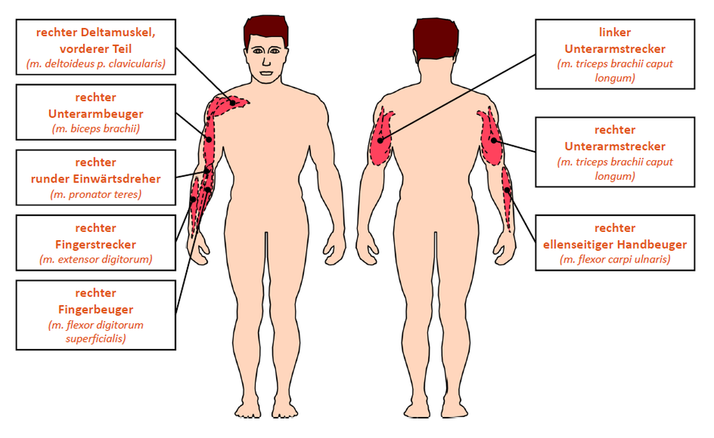 Während der Versuchsdurchführung wurde die elektromyographische Aktivität (EA) an 7 Muskeln des rechten und einem Muskel des linken Hand-Arm-Schulter-Systems erfasst. Die Strahlrohre wurden immer mit der rechten Hand gehalten und mit der Linken geführt sowie geöffnet und geschlossen, sodass für die 7 Muskeln der rechten Körperhälfte statische und für den linken m. triceps brachii dynamische Muskelarbeit angenommen wurde.