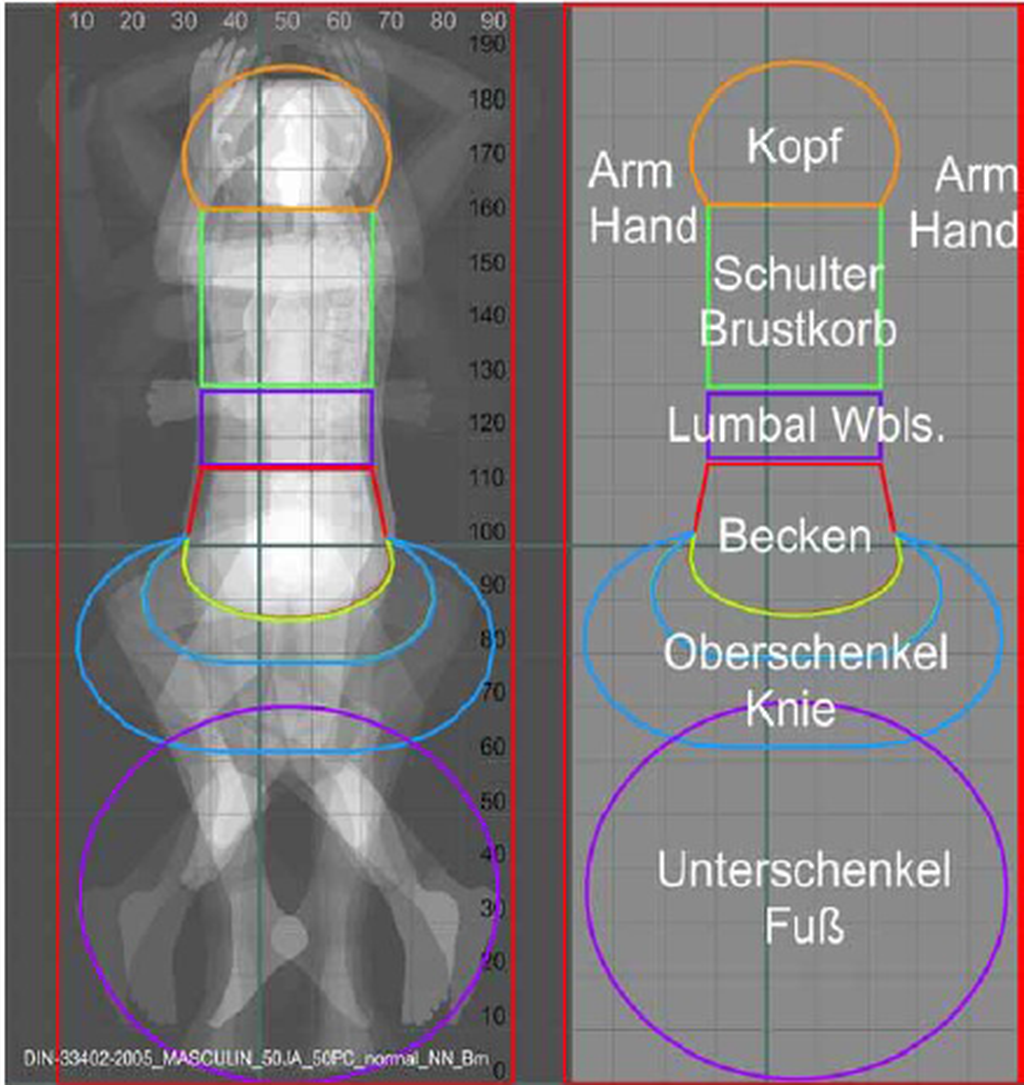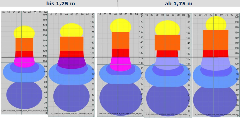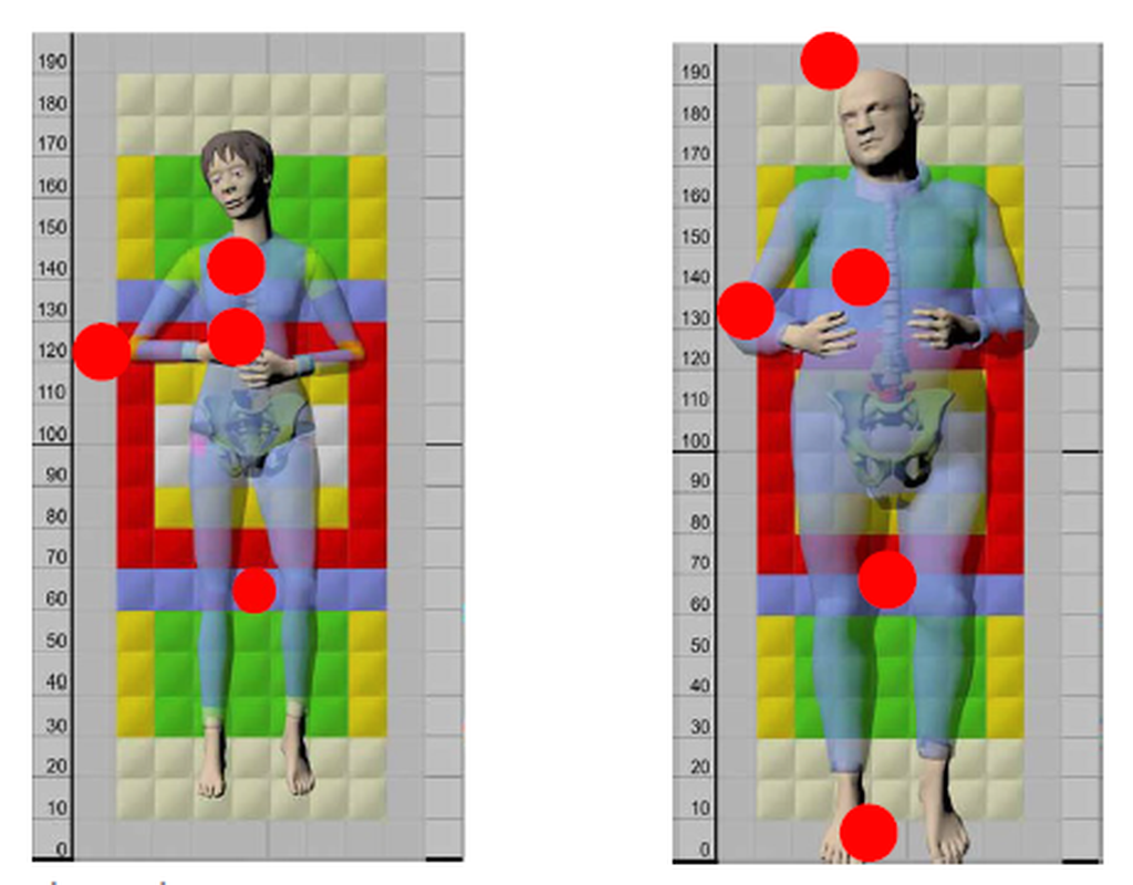 Abbildung 3: Matratzenzonen: links: Frau, 50 J., 5. Perzentil, normal, NN, Rückenlage, Becken mittig